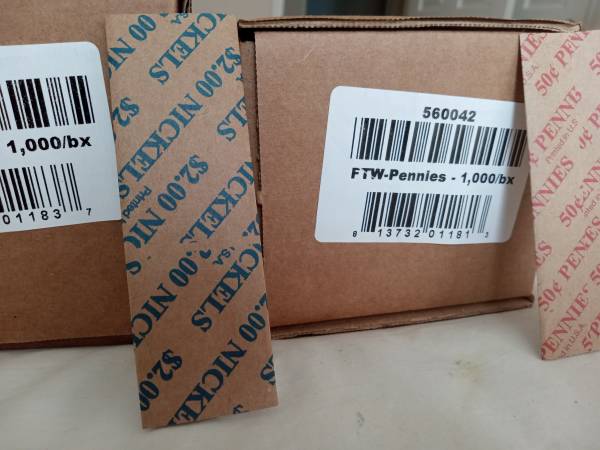 Coin Wrappers . Quarters , Dimes , Nickels, Pennies . Box of 1000 . ( used less than 100 ) Over 900 wrappers in each box. All for $40.00 Cash Only