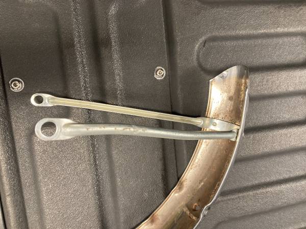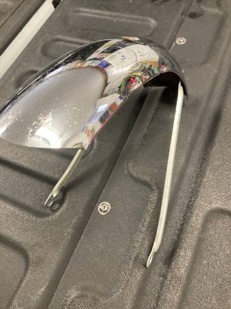 Front reproduction razor edge double dimple removed from a used reproduction Apple Krate with a 16" front wheel. Chrome has peppering and one side of brace is bent.