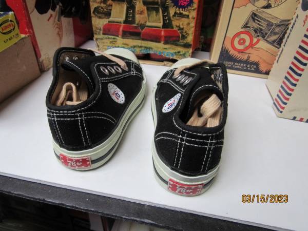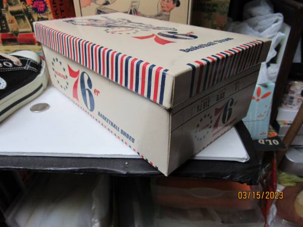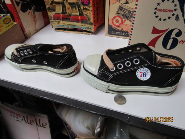 ****ONLY A FEW PAIR LEFT*** PHILADELPHIA 76ERS VINTAGE BASKETBALL SNEAKERS SHOES BOXED 1966-67 NEW OLD STOCK. Here are a very old pair of kids 76er sneakers/shoes still in the original box. Rubber and black canvas. They look like the old Chuck Taylor Converse sneakers. With the old logo on the side, inside the shoe and on the back. Style YJ 912 size 8.5. The way I understand it these were produced right after the 76ers won the championship in 1966-67 though not mentioned on the shoe or box. The logo was used from 1964 until mid 1970's. The shoes have been in this box for 60 years never used, new old stock. The canvas is brittle and the rubber is hard which is what you would expect. Has the laces as well. The box is in almost perfect condition, no damage. Has the tissue paper. Has the 76er logo over all four sides. The top also has the logo and shows an action scene. The bottom has instructions on how to play basketball. Again these are a kids size, they are 7.5 inches long. Made in Korea. Really unusual and rare.