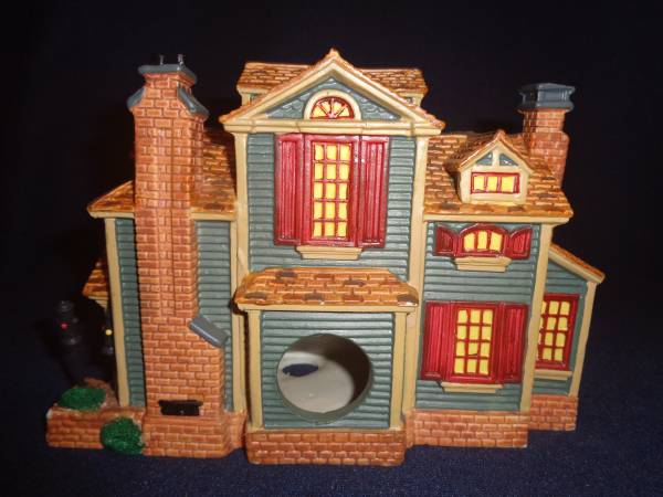 Hand-painted porcelain building. Railroad car (in front) is made of plastic. No light. No box. Pre-owned. Very good condition. There is a small chip in the porcelain on the left side of the base.