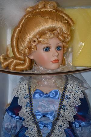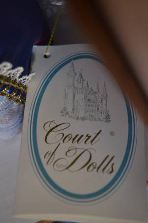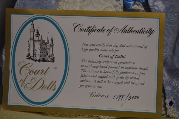 Victoria has blue eyes and blonde hair. Her elaborate hair style is highlighted with gold beads and a white plume. Her beautiful dress is accented with lace, blue ribbons, and blue and gold trim. A delicate gold fan completes the outfit.