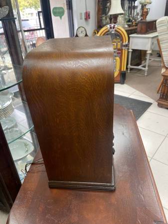). Located on 28 Harrison avenue Building #9 Englishtown New Jersey. Hours: Monday - Friday 9-4, Saturday 10-3. For sale is a very hard to find cathedral tombstone style radio made by DeWald around 1934. This example is model no 81, given by the ID plate on the back. The radio was plugged in, and when warmed does make a loud humming sound, that will change slightly with turning of the frequency knob, however I could not pick up any sound. May be a simple fix / adjustment but I have no idea. Please assume it will take some work to make this fully working. All of the other knobs appear to be working as they should. The radio displays beautifully and would make for great decor in any home. The cord looks to be an older replacement. It measures 14.5L x 9W x 17H. Check out our other listings as well! Something for everyone!!!!