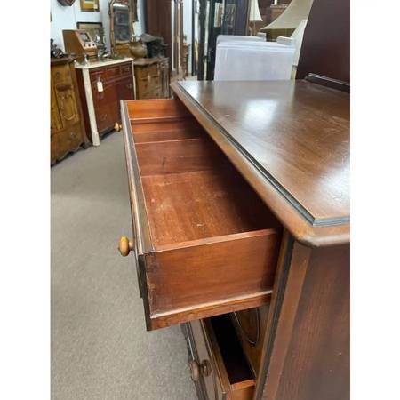 ). Located on 28 Harrison avenue Building #9 Englishtown New Jersey. Hours: Monday - Friday 9-4, Saturday 10-3. Available for sale is a vintage dresser made of solid wood, made by the company "Berkey & Gay". It has 4 shelves, each of which with a unique hand printed floral face. The drawers are held together with dovetail pegs as shown. The bottom 3 drawers are identical, but the top has a divider in the middle and is smaller in height. The dresser is nicely carved along the bottom with a very detailed support between the front legs. The dresser looks to still have all of the original hardware still attached. The finish looks to be original and is not perfect with signs of normal use such as light scratches, but still looks great as is. It measures 38L x 21W x 45H. Delivery available within a certain distance. Check out our other listings as well! Something for everyone!!!!