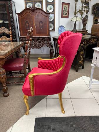 ). Located on 28 Harrison avenue Building #9 Englishtown New Jersey. Hours: Monday - Friday 9-4, Saturday 10-3. Beautiful condition pair of vintage wingback accent chairs. The chairs are made with a red silk like material, with a solid wood frame. All of the exposed wood has detailed carvings and gold leafing. The chairs are older, but almost appear to have been recently restored due to how well they have been kept. Sturdy but not too heavy to be a problem moving around when needed. Very eye cacthing styling, sure to compliment the theme of any home. Each chair measures 26L x 30W x 41H, With a seat height of 18" and arm height of 24". Local delivery available!