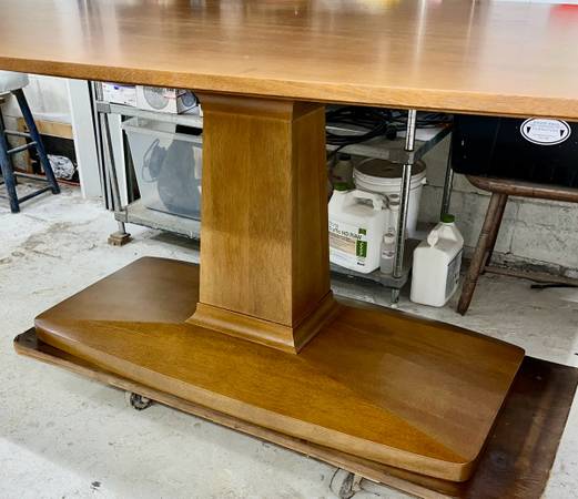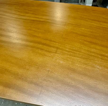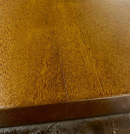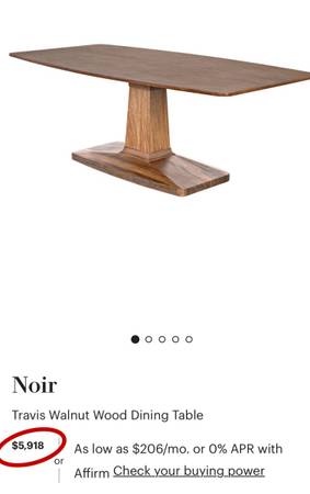 Noir Travis dining table. This table was professionally refinished by a bespoke cabinet shop. I was unhappy with the limited color selection and wanted a warmer Walnut. There is some hairline wood movement on the base only as shown in the photos. These are not noticeable unless you get on the floor and examine up close. In no way does this affect the structural integrity. This table is solid and stable as a rock.