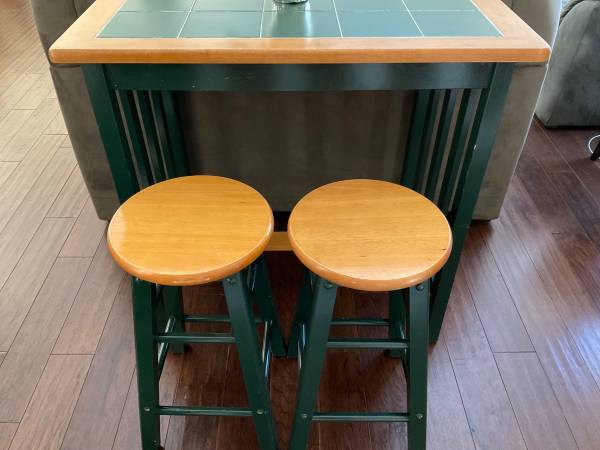 Table and 2 stools. This is a wood and hunter green tile top counter height table. The table is 35 inches across, 22 inches deep and 34 inches high. In great condition. $75 cash and carry