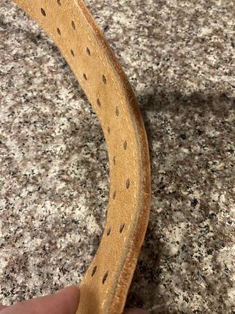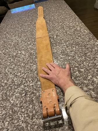 GOLDS GYM THICK FULL GRAIN LEATHER WEIGHTLIFTING BELT. Size is XL (42-46) but has plenty of spacer slots for variance. Belt is in excellent condition but unfortunately could not work out the back...