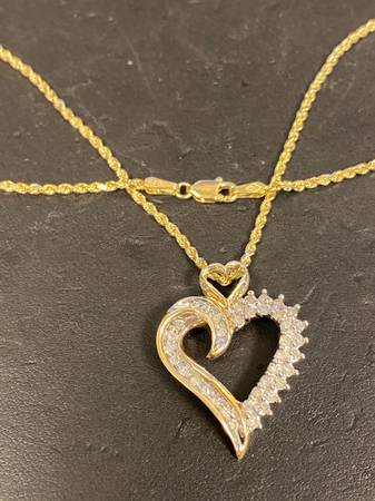 6.7 grams of 10 K gold one carat total weight of genuine diamonds heart pendant with 16 inches length rope chain , all details are in pictures posted, price is $775 , firm on the price , ask me...